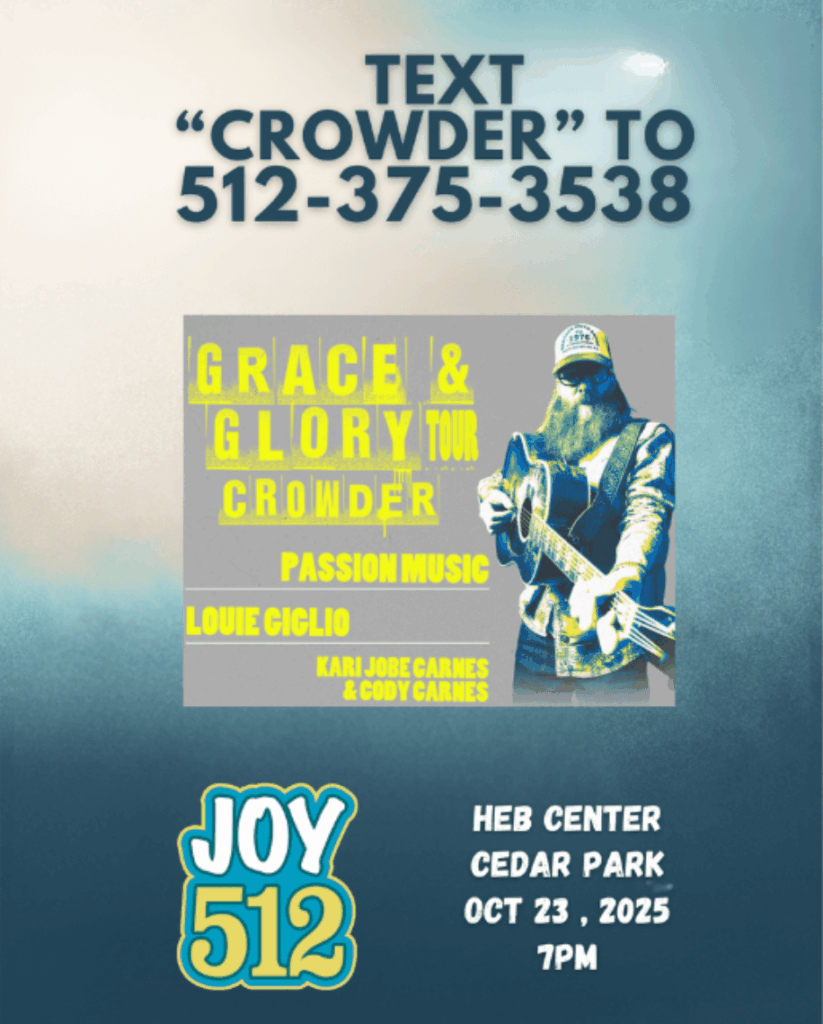 Text CROWDER to 512-375-3538 to enter to win a pair of tickets to The Grace and Glory Tour with Crowder, featuring Passion Music, Louie Giglio, and Kari Jobe Carnes & Cody Carnes. Join us for a powerful night, bringing songs that have shaped worship movements, like “Grave Robber,” “Glorious Day,” and “The Blessing.” Whether you need a reminder of grace or a moment to soak in His presence, this is where it happens. Gather your friends and get your tickets before they’re gone!